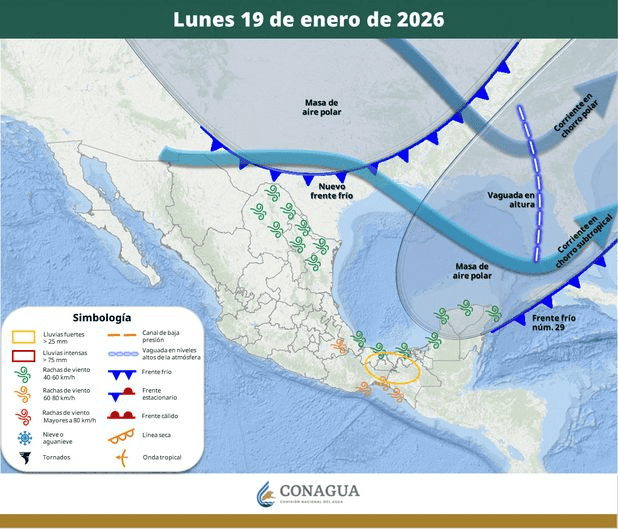 El frente frío número 29 se retirará del país el lunes 19 de enero, mismo día en que se prevé el ingreso del frente frío número 30 por el norte.