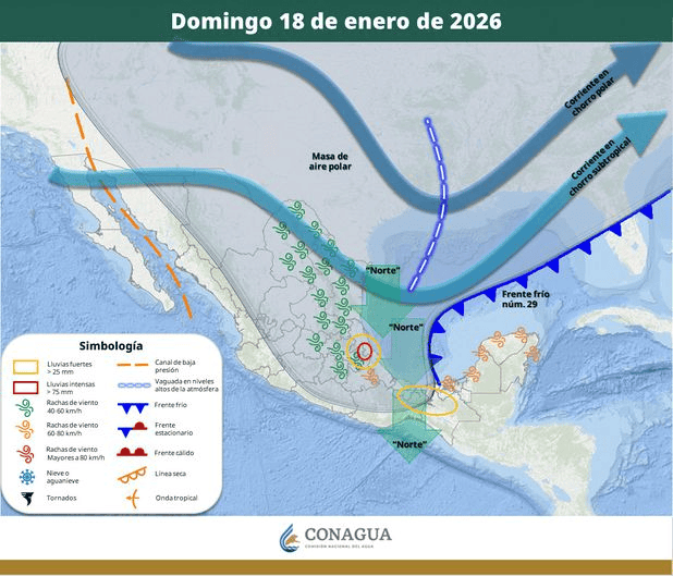 El SMN también advirtió sobre un nuevo evento de "Norte" que se formará la noche del sábado y se intensificará el domingo, con rachas de viento de hasta 100 km/h en el Istmo y Golfo de Tehuantepec, además de oleaje elevado en costas de Tamaulipas, Veracruz y Oaxaca.