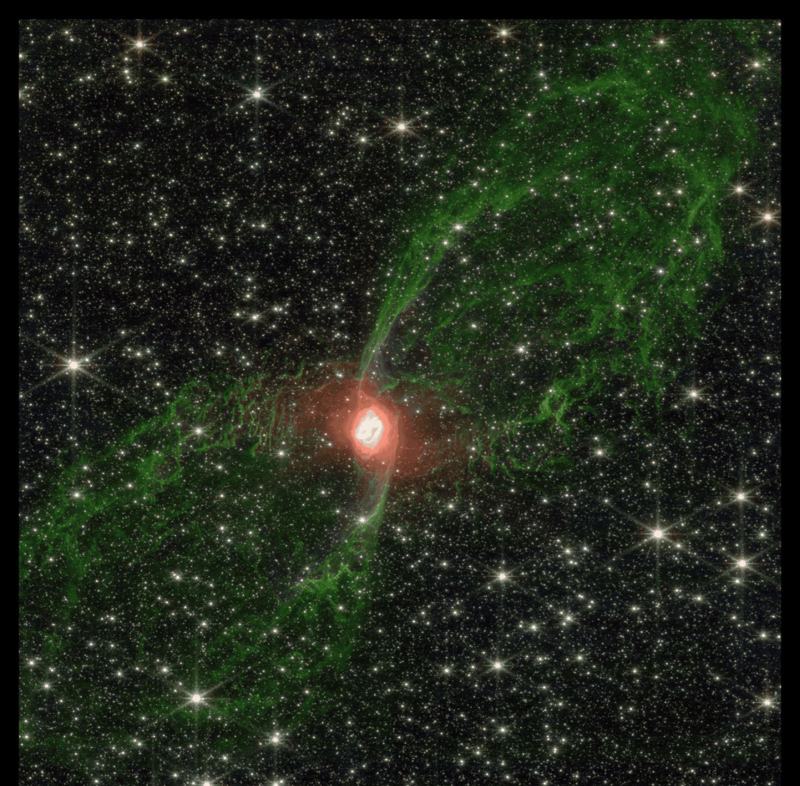 La nueva observación del Webb muestra, por primera vez, la extensión completa de los enormes lóbulos que conforman las "patas" de la araña. Estas burbujas azuladas, formadas por moléculas de hidrógeno (H₂), se expanden unos tres años luz desde el centro, infladas lentamente por el gas emitido durante milenios.