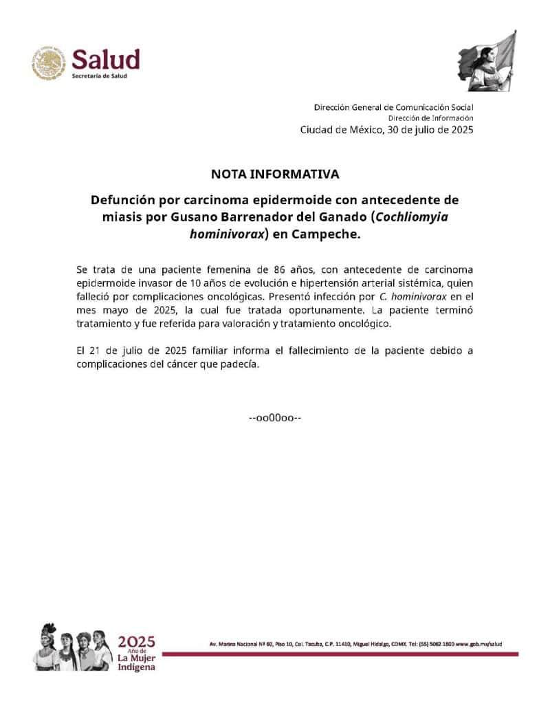 La víctima fue una mujer de 86 años, habitante del municipio de Candelaria, Campeche, quien enfrentaba un cáncer de piel avanzado, además de otros padecimientos crónicos como hipertensión. La paciente fue atendida en mayo de 2025 tras presentar una infestación larvaria, la cual complicó gravemente su estado de salud.