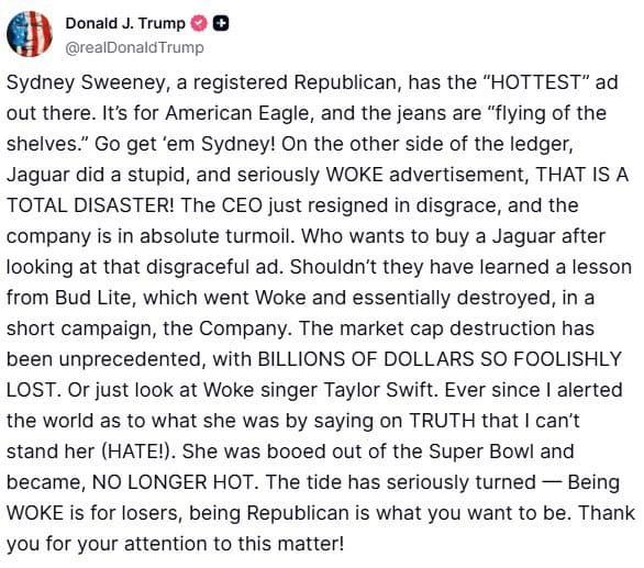 Esto representa un respiro para la compañía, que en el último año ha visto caer su valor alrededor del 33 % debido a la caída en ventas. Tras ser informado de que la actriz está registrada como republicana, Trump expresó a la prensa que “le encanta el anuncio”, y al día siguiente publicó en su red Truth Social que la campaña es la “más popular” del momento, y que los jeans “vuelan de las estanterías”.