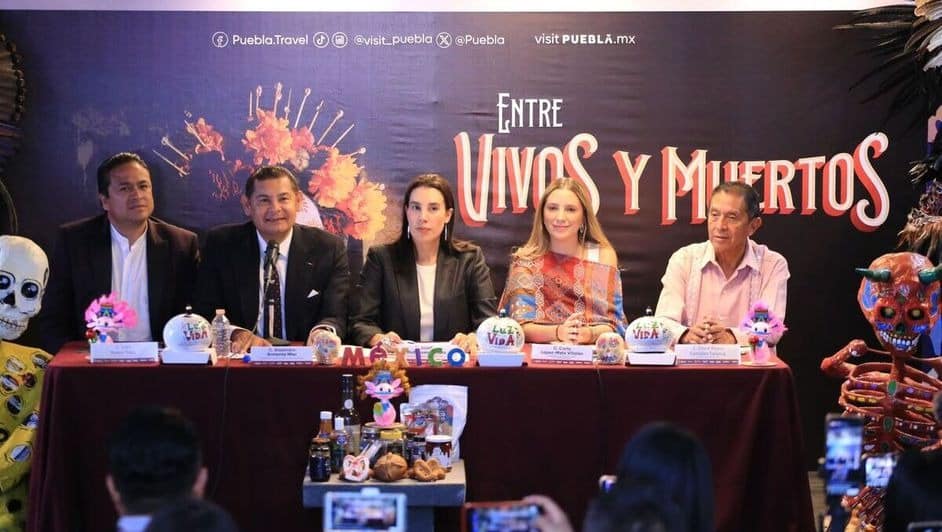 El gobernador Alejandro Armenta y la secretaria estatal Carla López Malo subrayaron el papel de Puebla como destino clave, con festivales como El Valle de Catrinas (Atlixco), el Festival de la Luz y la Vida (Chignahuapan), y altares monumentales en Tochimilco y Huaquechula.