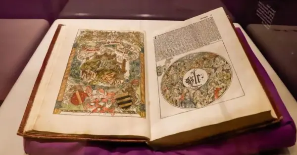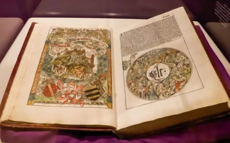 - Uno de los tesoros que reciban a los visitantes es un incunable: la Crónica de Nuremberg de Hartmann Schedel, impresa en 1493.
