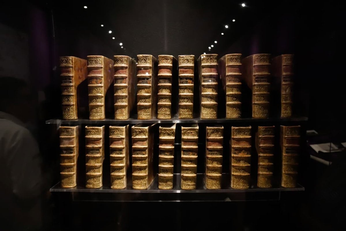 Otra joya exhibida es la Biblia políglota de Amberes, monumental obra en ocho volúmenes que reúne 10 lenguas antiguas, incluyendo narrativas que ubican a los primeros pobladores de América dentro de una perspectiva teológica global.