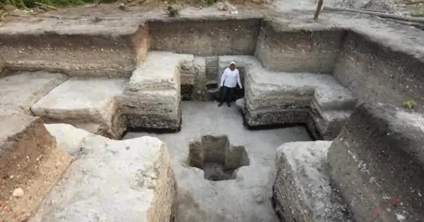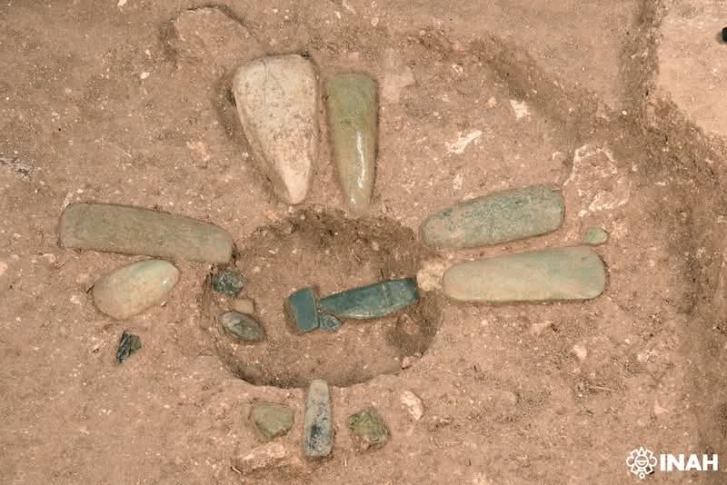 "El equipo de investigación descubrió en su interior 24 objetos con forma de hacha, realizados en arcilla sin cocer, algunos con restos de pigmento rojo, mientras que, al centro, se registró otro elemento cruciforme más pequeño, excavado a un metro de profundidad, directamente en la roca caliza. Este pequeño cruciforme contenía un depósito ritual, conformado por una base cuadrada de arcilla negra (la cual sostuvo un poste de madera al centro) que presentaba pigmentos de diversos colores en sus lados norte, este y sur: azul, hecho de azurita; verde, a base de malaquita, y amarillo-ocre, que contenía goethita".