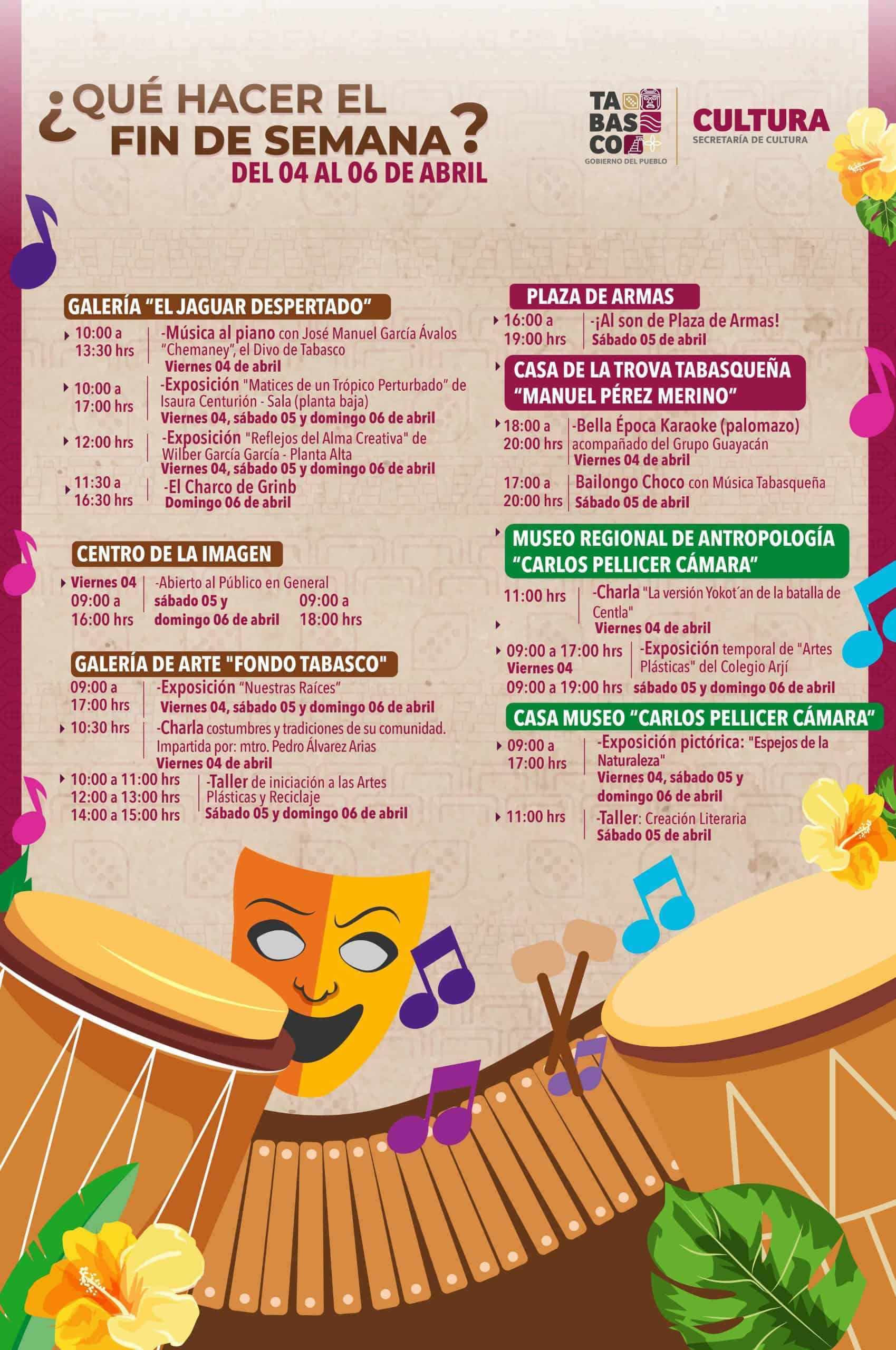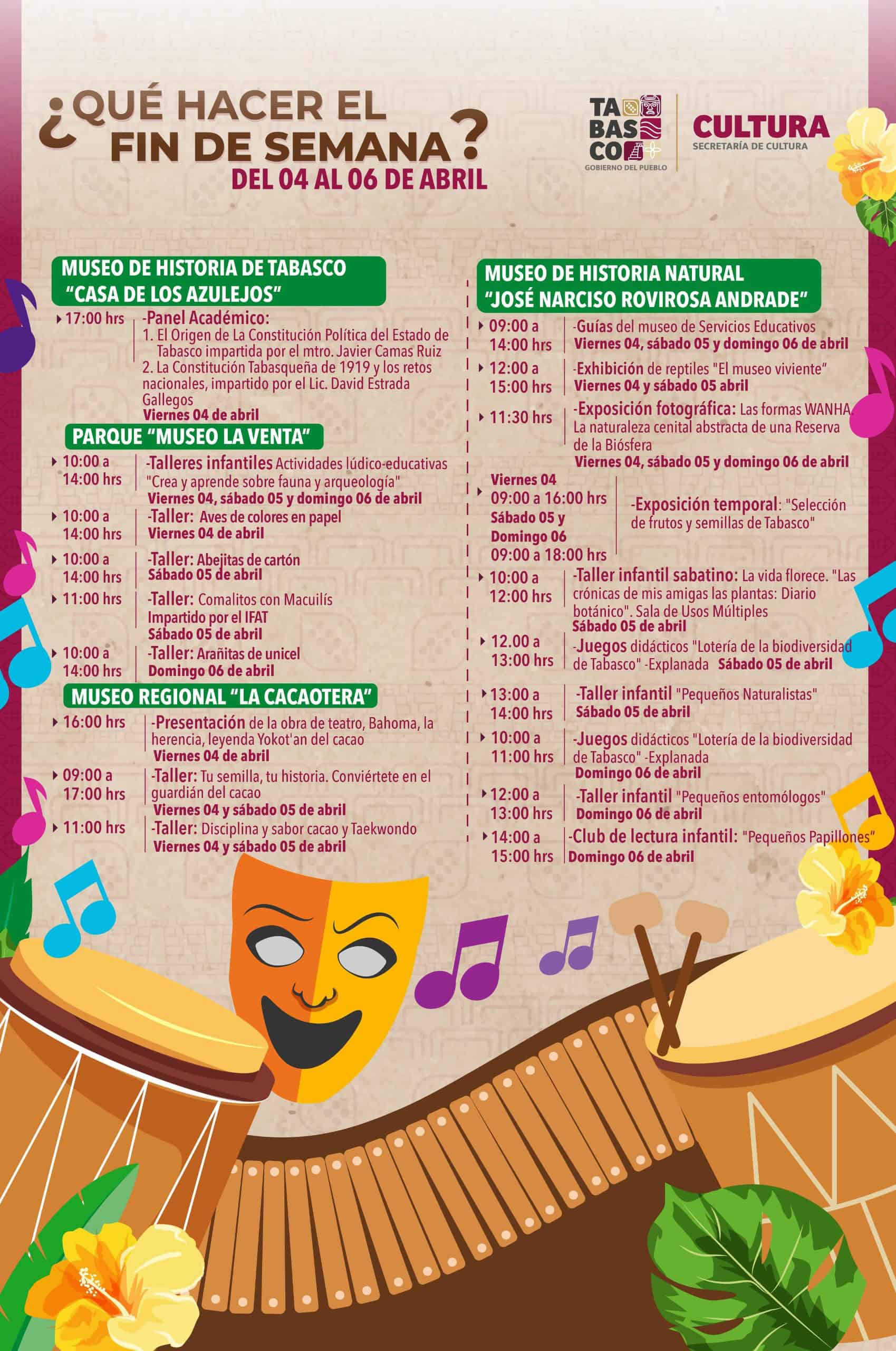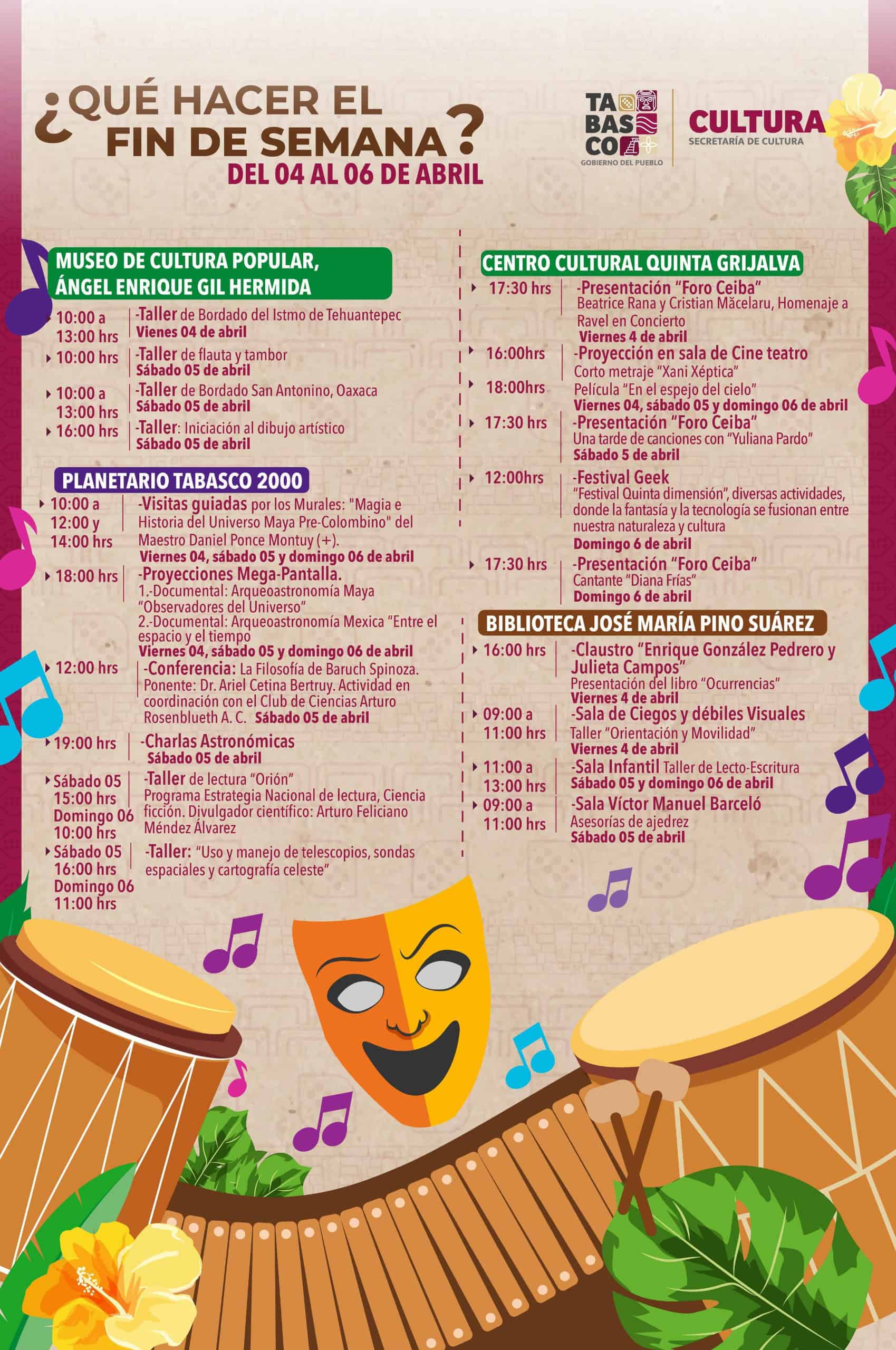 Este fin de semana, del 4 al 6 de abril, Tabasco se llenará de cultura y aprendizaje con una impresionante oferta de actividades organizadas por la Secretaría de Cultura del Estado.