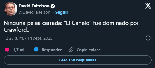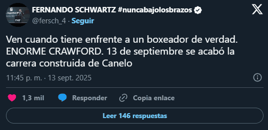 Fernando Schwartz fue todavía más severo: "Ven cuando tiene enfrente a un boxeador de verdad. Enorme Crawford. 13 de septiembre se acabó la carrera construida de Canelo".