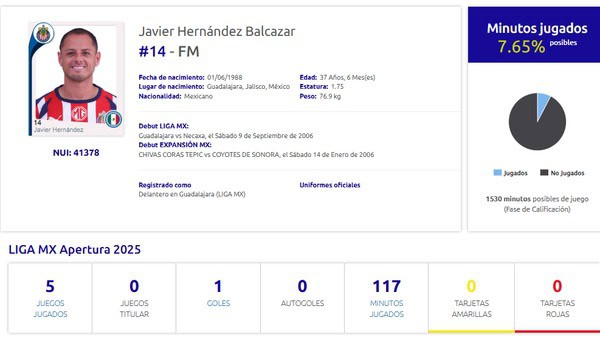 Chicharito regresó a Chivas en enero de 2024 con la expectativa de ser el referente goleador, tras su éxito en Europa con clubes como Manchester United, Real Madrid y Bayer Leverkusen. Sin embargo, solo disputó cinco partidos en el torneo Apertura 2025, acumulando 117 minutos en cancha y anotando un único gol.