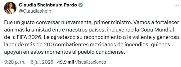 Por su parte, Carney compartió en redes sociales su entusiasmo tras dialogar con Sheinbaum y agradeció el obsequio de un balón conmemorativo del Mundial.