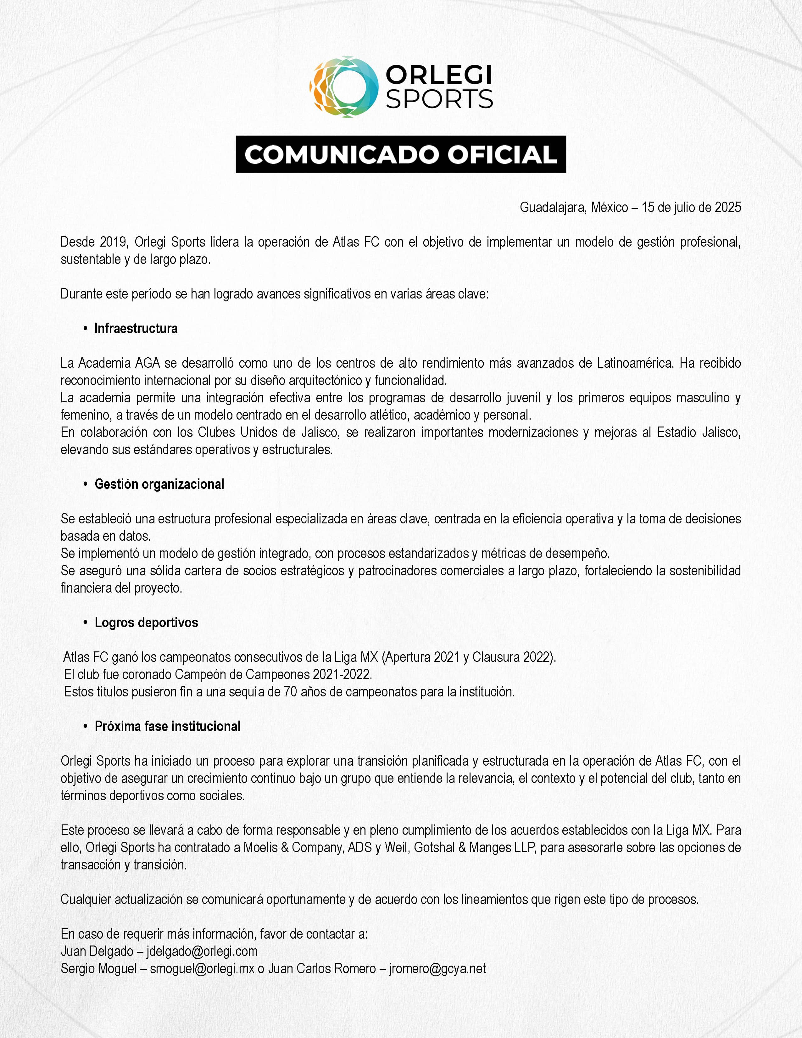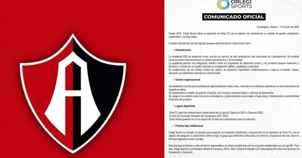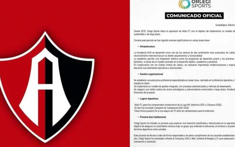 “Orlegi Sports ha iniciado un proceso para explorar una transición planificada y estructurada en la operación de Atlas FC, con el objetivo de asegurar un crecimiento continuo bajo un grupo que entienda la relevancia, el contexto y el potencial del club”, señaló la organización.