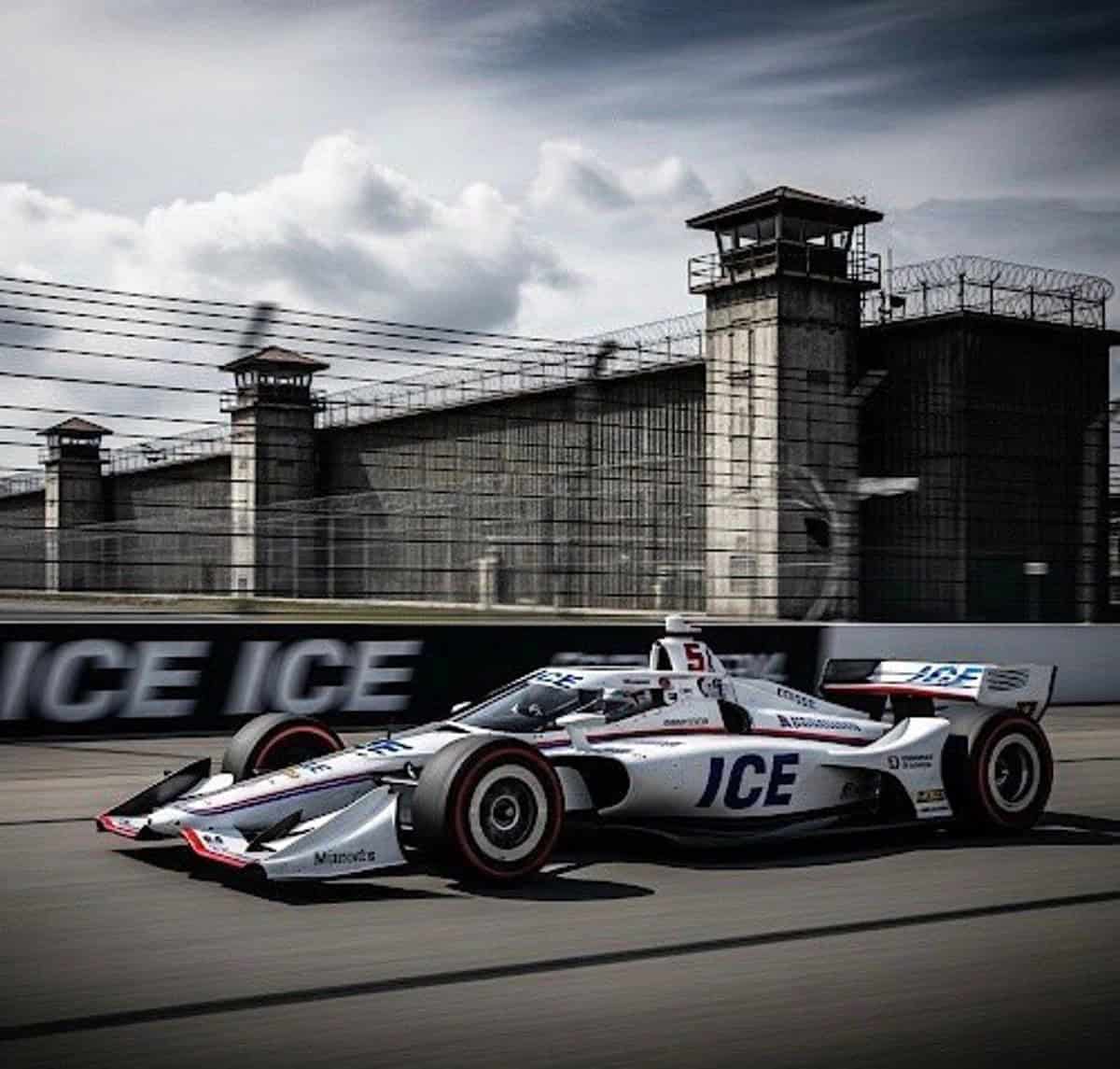 - La imagen, al parecer generada por computadora, mostraba el auto número 5 en una pista con un edificio tipo prisión al fondo, y fue difundida como parte del anuncio de la secretaria de Seguridad Nacional, Kristi Noem.