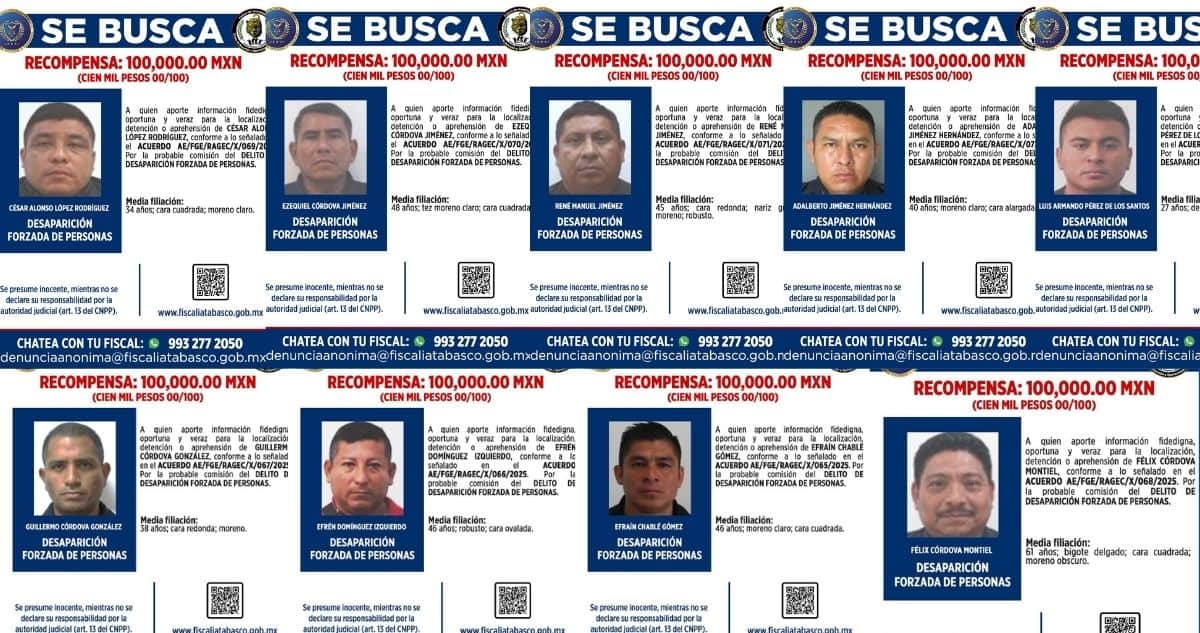 Nueve policías presuntamente implicados en la desaparición forzada de tres jóvenes en el municipio de Paraíso, son buscados por autoridades policíacas que ofrecen 100 mil pesos de recompensa por cada uno.