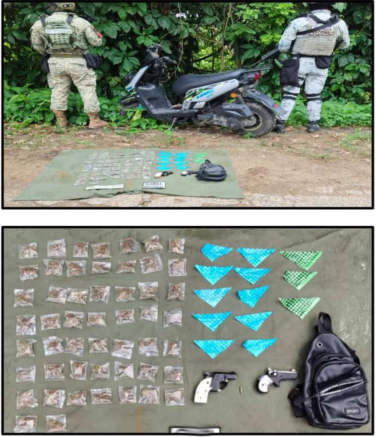 También se les hallaron una motocicleta sin placas de circulación, un arma de fuego corta calibre 9 milímetros, un cargador y 23 cartuchos. En cuanto a las drogas aseguradas, fueron 47 dosis de marihuana y 25 de cristal, junto a dos teléfonos celulares, una mochila y dos cartulinas con mensajes amenazantes.
