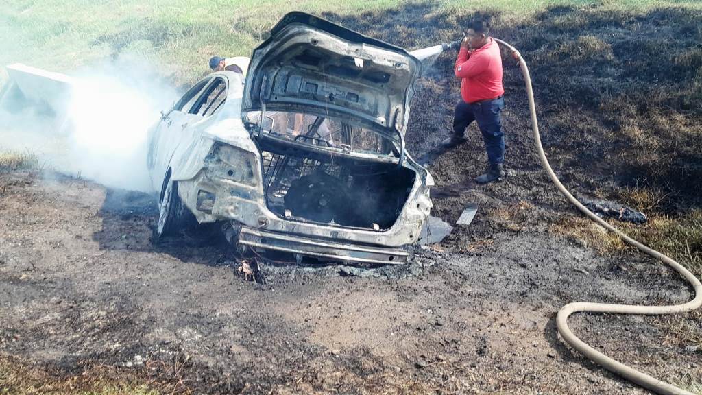 Auto compacto cae a la cuneta central de la carretera federal Villahermosa – Cárdenas y arde; los tripulantes fueron rescatados