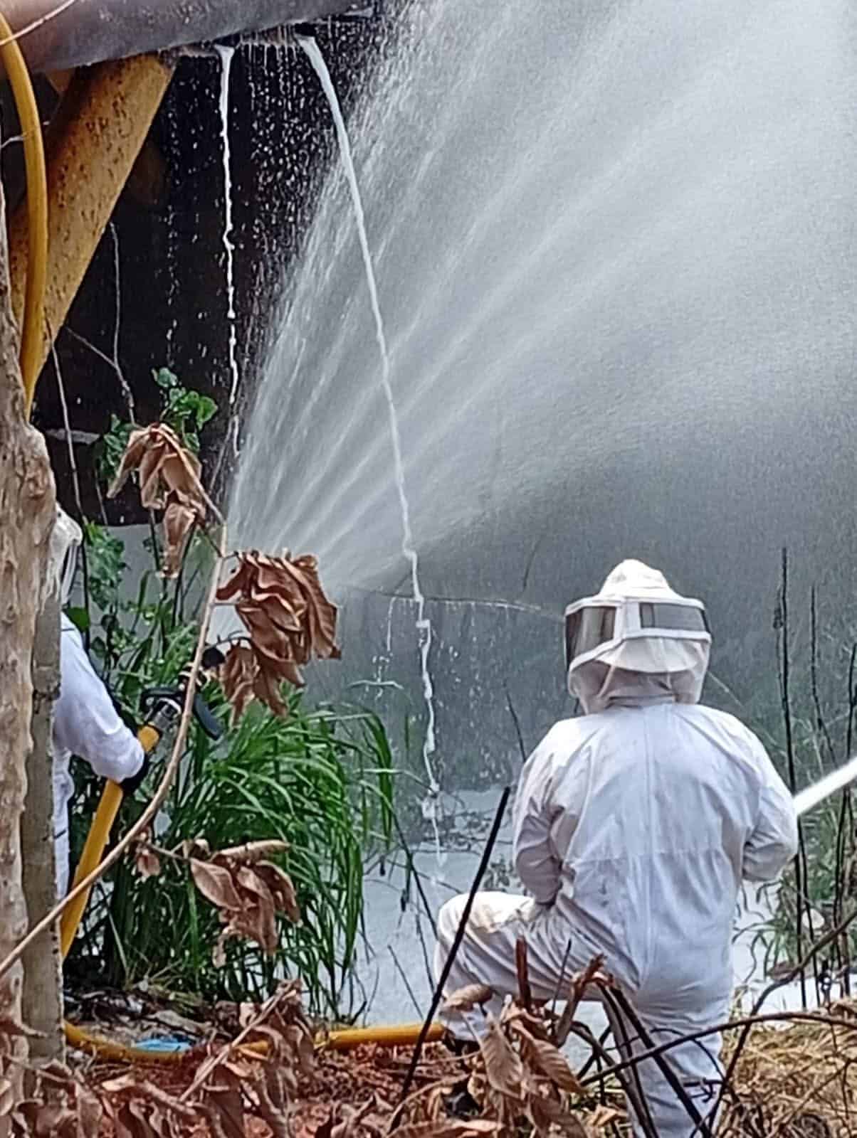 Tras las labores de control, bomberos y rescatistas utilizaron agua para dispersar a las abejas, logrando así retirar el peligro y permitir que los trabajos de mantenimiento en la obra continuaran con normalidad.