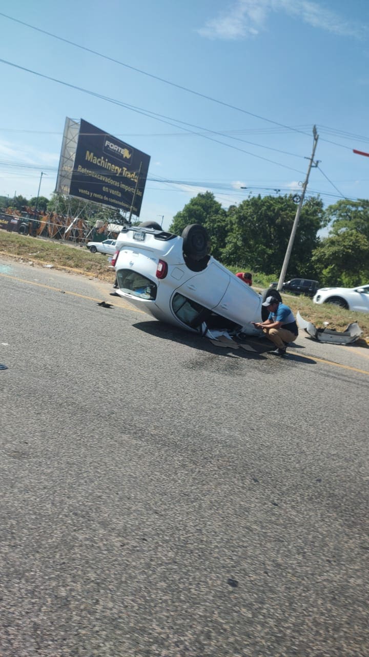 El accidente ocurrió cuando el conductor de un vehículo Nissan March color blanco que circulaba a exceso de velocidad chocó con el acotamiento, perdió el control y volcó en el carril central quedando con las llantas al aire.