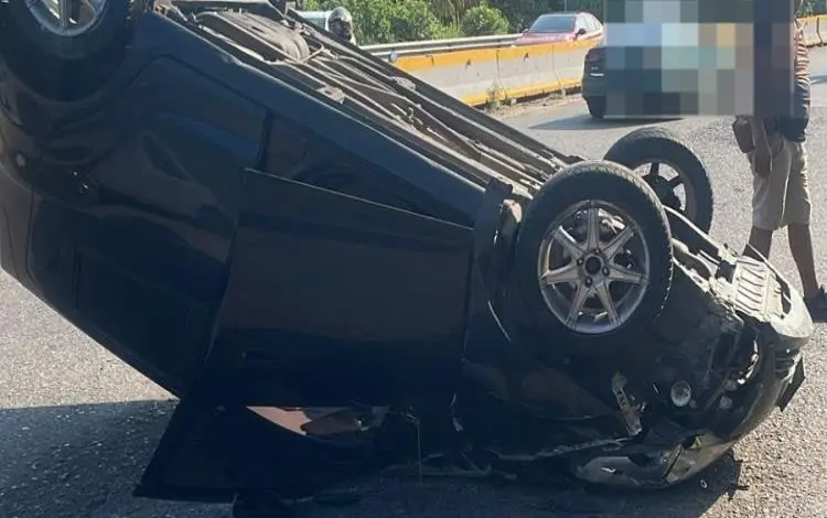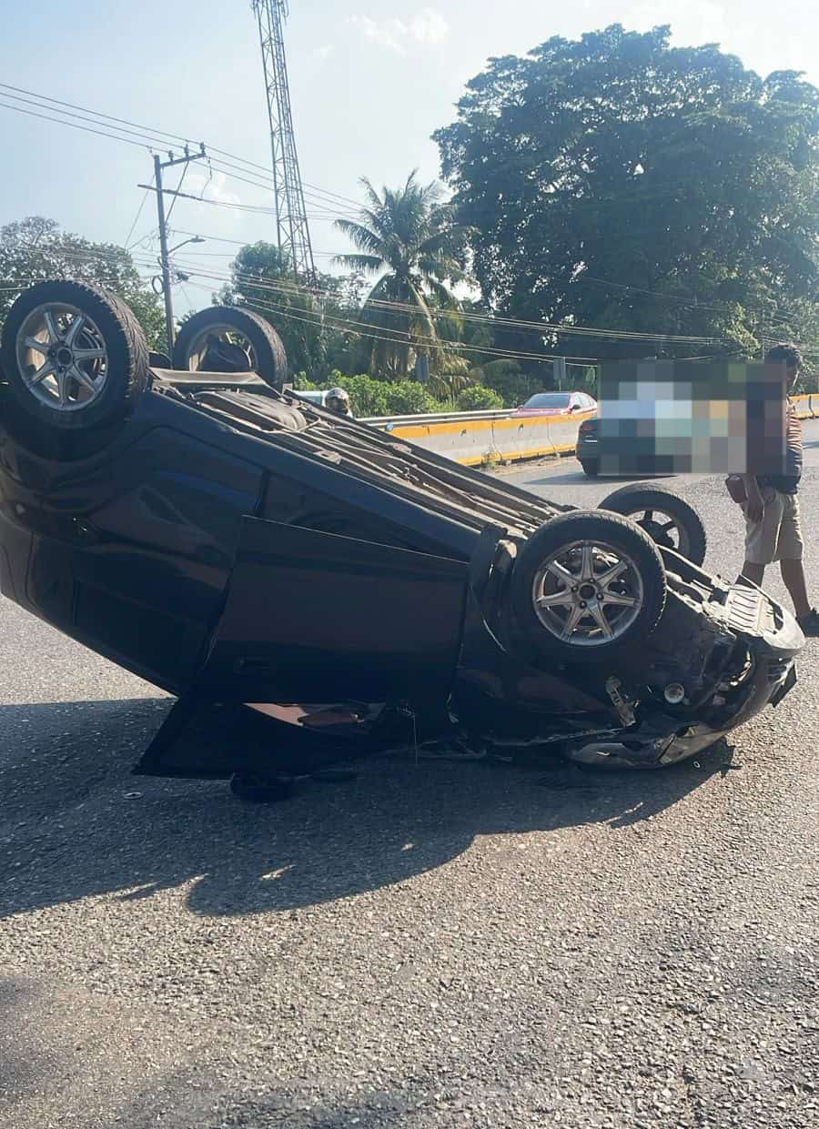 En dicho lugar, el conductor del auto compacto perdió el control del volante e impactó contra el muro de contención; terminó por volcar en medio de la carpeta de rodamiento.