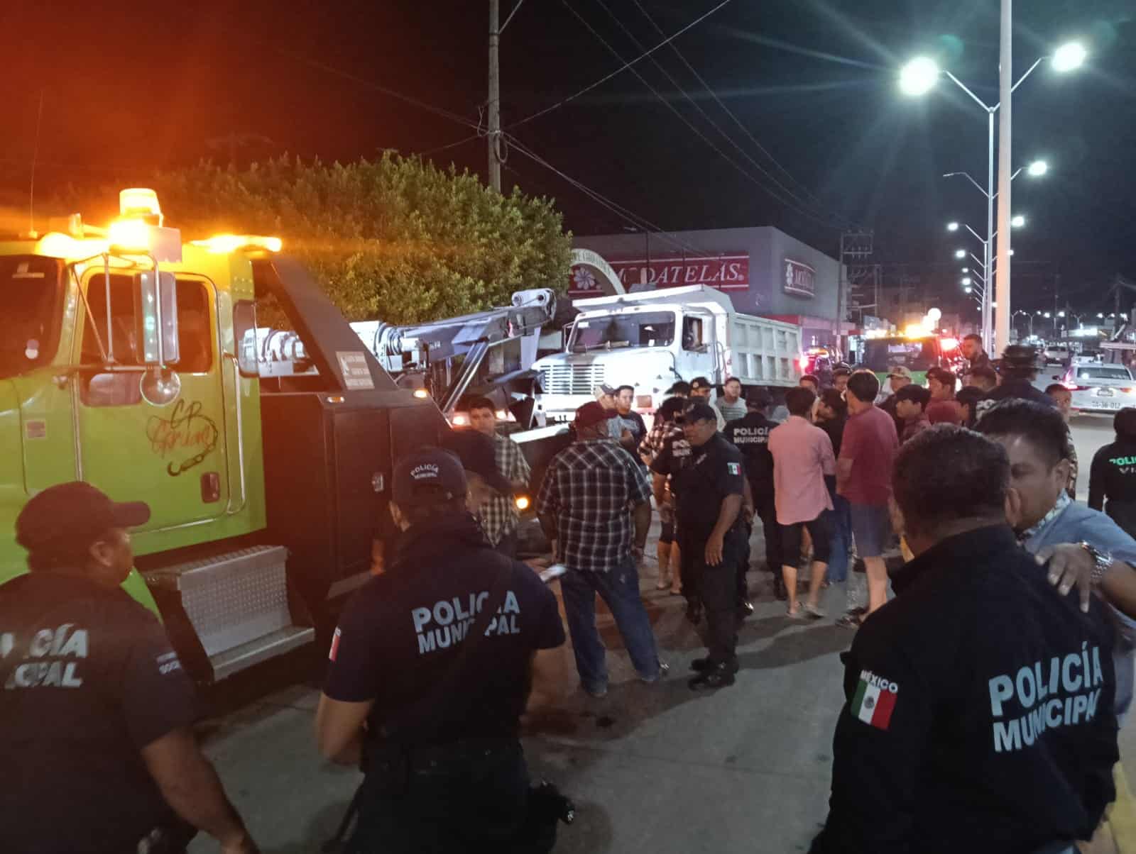 La noche del lunes se registró un accidente vial en el Paseo José Narciso Rovirosa, donde el conductor de un volteo se quedó sin freno y estuvo a punto de aplastar a varias personas, pero terminó colisionando contra una camioneta.