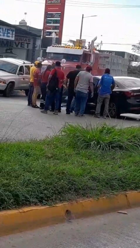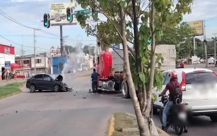 - El conductor de un vehículo intentó ganar el semáforo y terminó impactándose de frente contra un tractocamión que transportaba blocks.