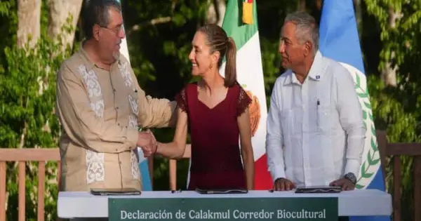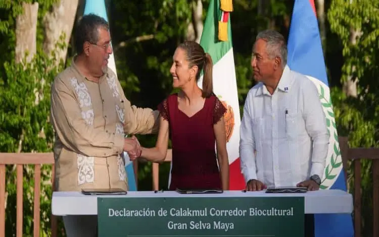 La Presidenta de México, Claudia Sheinbaum Pardo, firmó un acuerdo trilateral sin precedentes con sus homólogos de Guatemala, Bernardo Arévalo de León; y de Belice, John Antonio Briceño, para preservar 5.7 millones de hectáreas del corazón de Mesoamérica, a través de la creación de un nuevo Corredor Biocultural de la Gran Selva Maya.