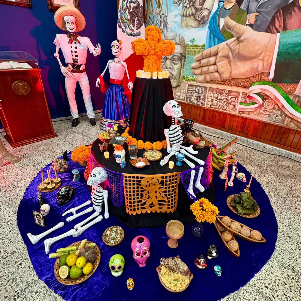 Ubicado en el vestíbulo del Tribunal, el altar muestra elementos tradicionales como velas de cebo, sal, agua e incienso, productos regionales, tales como tamales, pan de muerto, calabaza, mole, flores de cempasúchil y papel picado, así como fotografías de por lo menos 37 funcionarios que ya no se encuentran entre nosotros.