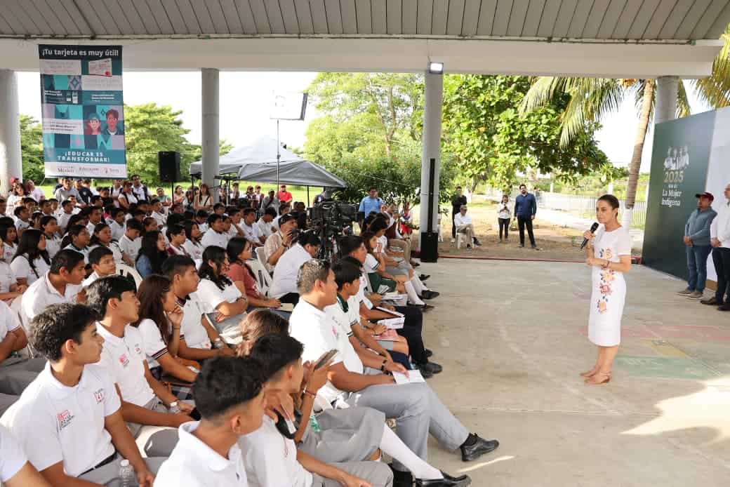 - En su quinta visita del año al Edén de México, la mandataria nacional destacó que a la beca "Benito Juárez", que en Tabasco beneficiará a más de 100 mil estudiantes del subsistema de educación media superior durante el presente ciclo escolar, se suma la beca "Rita Cetina" que atiende a más de 122 mil estudiantes tabasqueños del nivel secundaria, y por primera vez en la historia, beneficiará con estímulos económicos, a partir del año entrante, a más de 140 mil niñas y niños de las primarias públicas de la entidad.