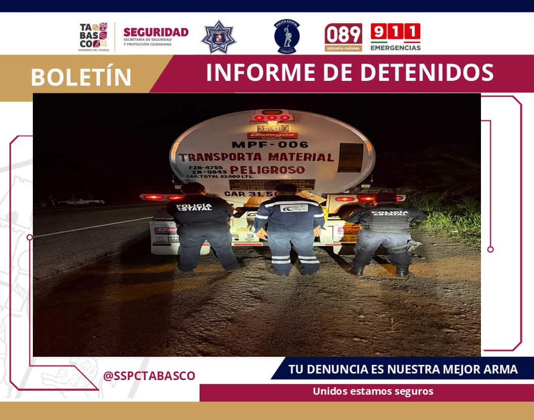 Elementos del Grupo Especial Tabscoob pertenecientes a la Secretaría de Seguridad y Protección Ciudadana (SSPC), en coordinación con la Fuerza Interinstitucional de Reacción Táctica (FIRT) Olmeca, logró la detención de un masculino por el presunto delito de transporte de hidrocarburo de procedencia ilícita.