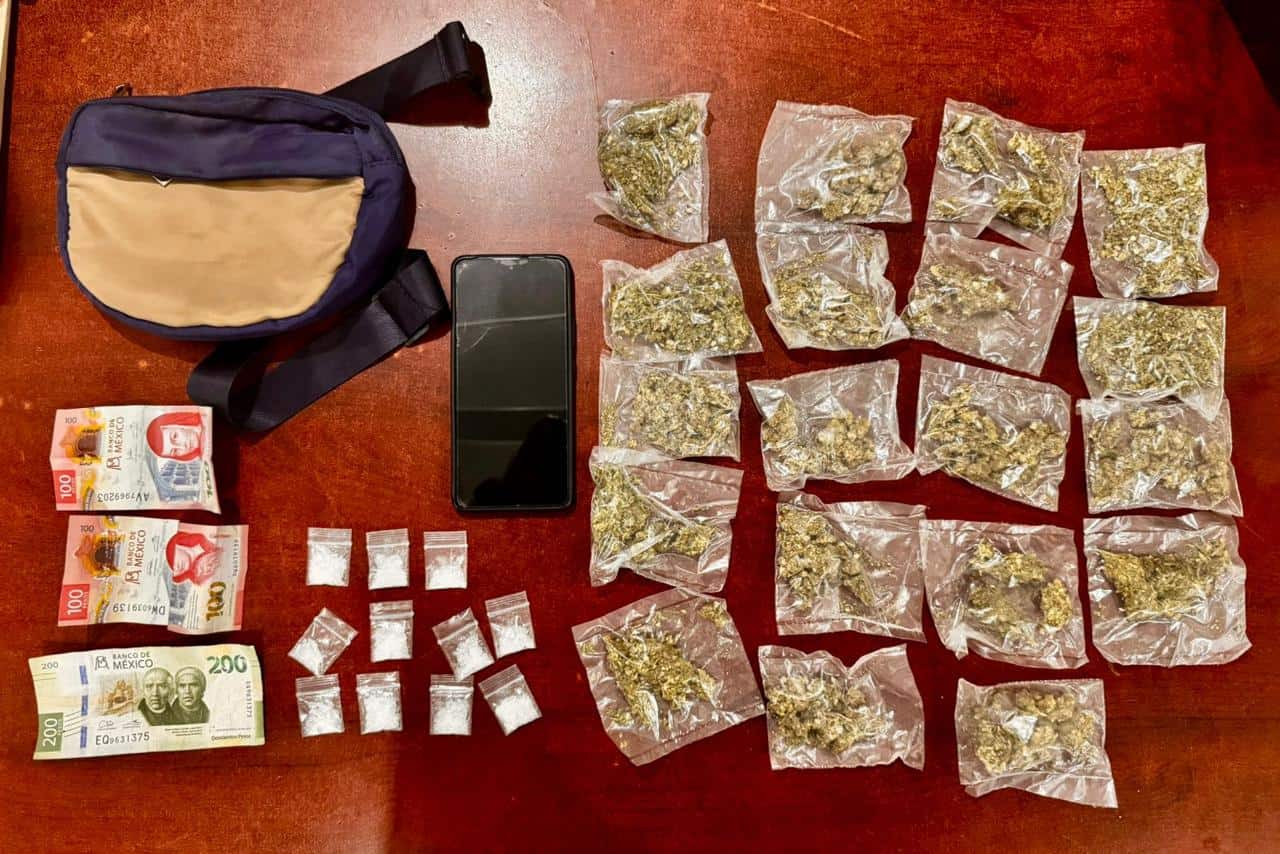 Durante su detención se le decomisó una bolsa mariconera color azul con beige, dos teléfonos celulares, un vehículo marca Chevrolet línea Aveo colo rojo de reciente modelo, varias bolsitas con marihuana y de la droga conocida como "cristal" y dinero en efectivo.