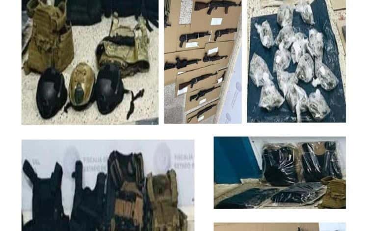 En el lugar se aseguraron 160 dosis de marihuana, 40 dosis de cristal, tres automóviles, una camioneta, dos motocicletas, 13 armas de fuego largas, cuatro armas de fuego cortas, 50 cargadores, 1,688 cartuchos útiles, 20 equipos telefónicos, siete chalecos balísticos, siete cascos tácticos, cinco básculas grameras y una cámara de video.