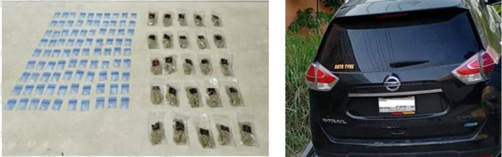 Durante la acción operativa, a la detenida se le aseguraron varias bolsitas transparentes que contenían una sustancia granulosa y transparente con características similares a la droga conocida como cristal, así como bolsitas con hierba seca color verde, presumiblemente marihuana. Además, se aseguró una camioneta Nissan, modelo X-Trail.