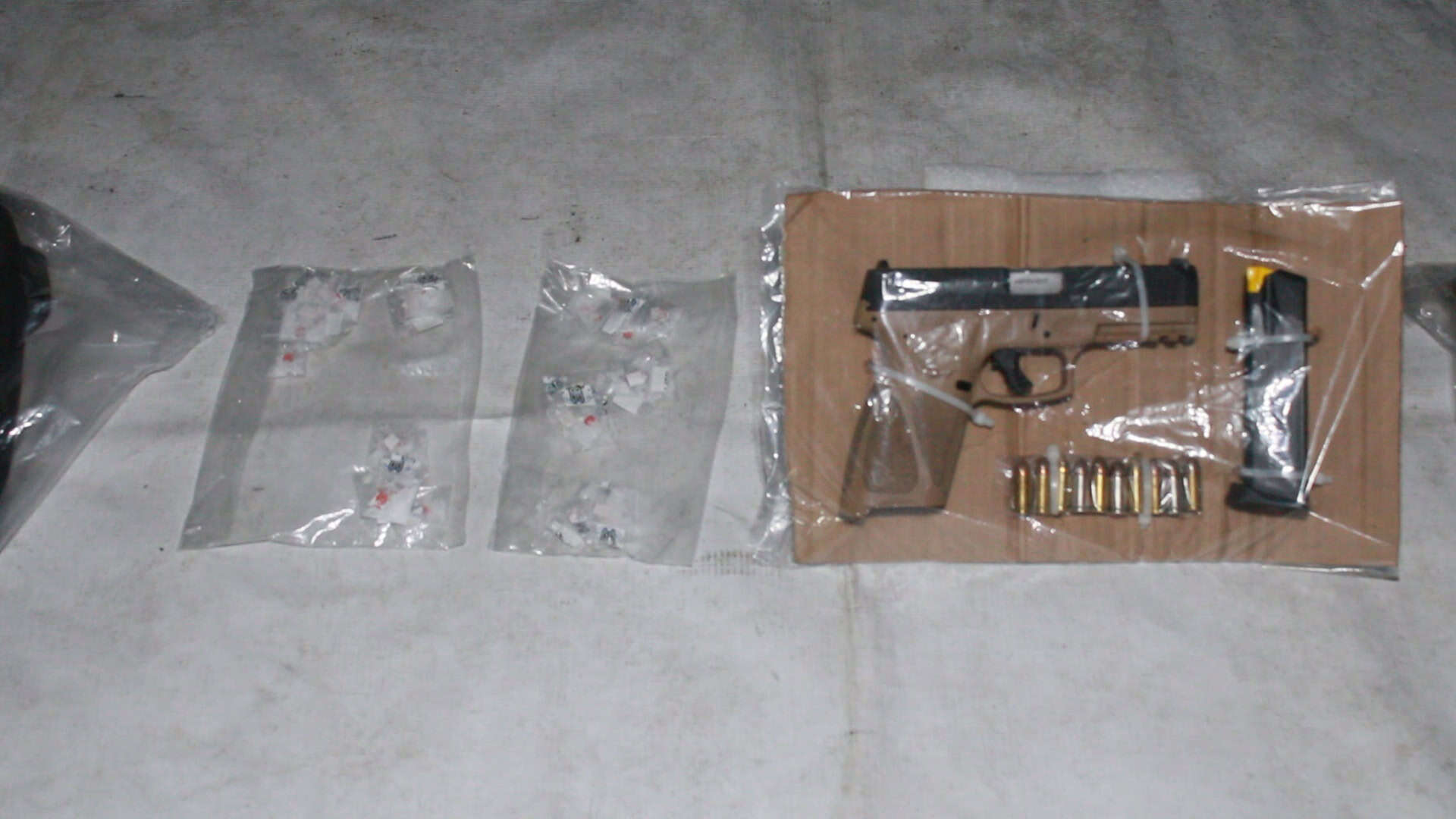 Los agentes interceptaron un vehículo Volkswagen Jetta blanco, sin placas, en el que viajaban los sospechosos; durante la inspección localizaron dos maletas con droga y un arma de fuego.