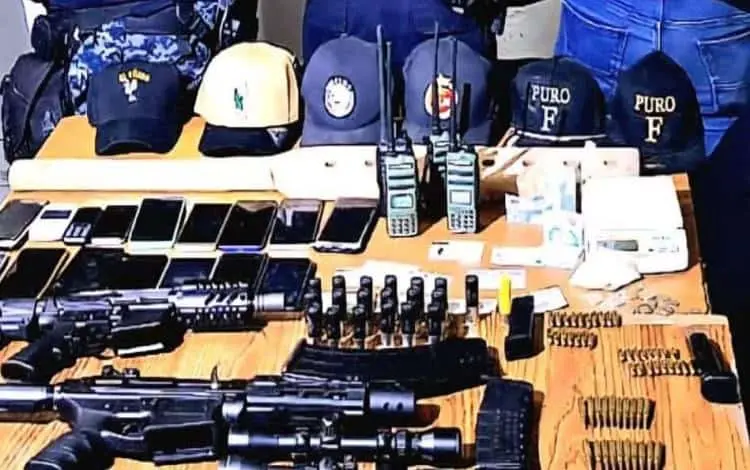 Además de 16 celulares, 4 radios de comunicación, una báscula gramera, 9 gorras, 2 miras telescópicas, 120 pesos, moneda nacional en diferentes denominaciones, una tabla de madera con mango.
