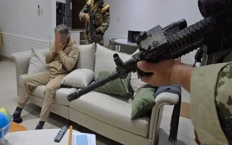 Los uniformados con armas largas suben a la segunda planta de la vivienda, en el interior de una de las recámaras aseguran al ex secretario de Seguridad Pública, lo derriban al suelo, lo someten, le gritan que no oponga resistencia.