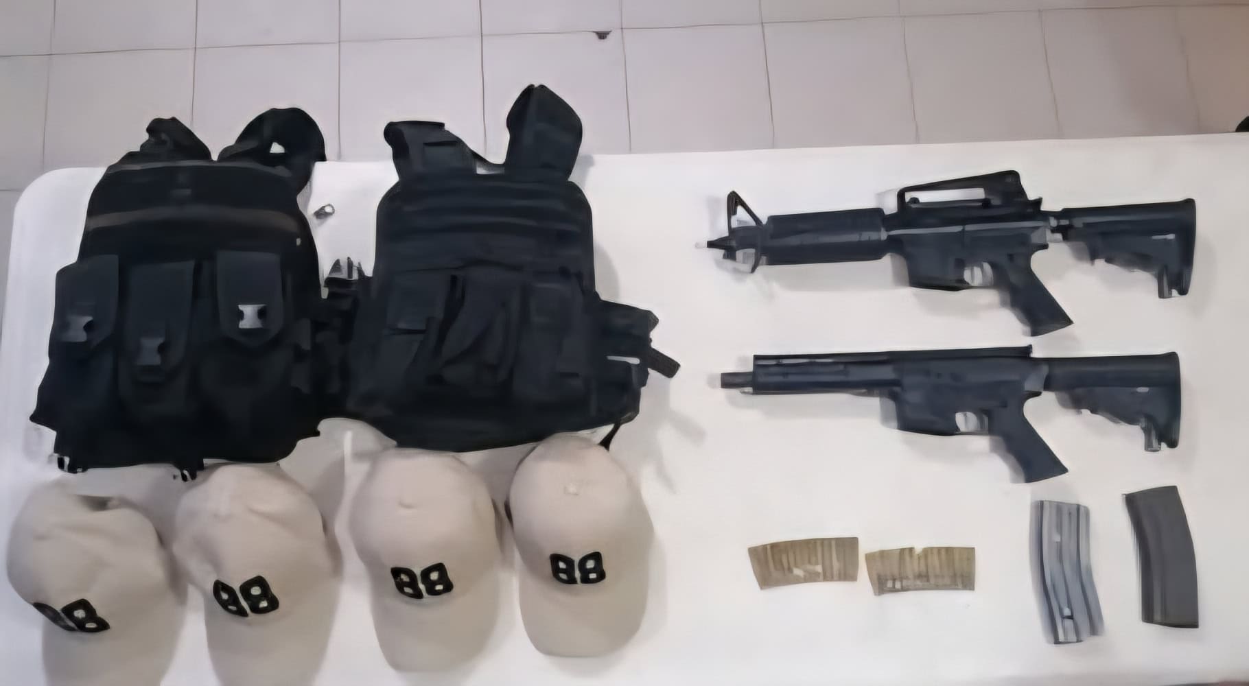 - Durante la detención les aseguraron un arma larga color Negro marca Smith Wesson Springfield, dos cargadores con 15 cartuchos útiles cada uno, un arma larga color negro M4 Carabine calibre 223, 02 chalecos con placas balísticas, 04 gorras color caqui con la leyenda en la parte frontal 88, en el lateral derecho la leyenda CJNG y lateral izquierdo la leyenda Tabasco.