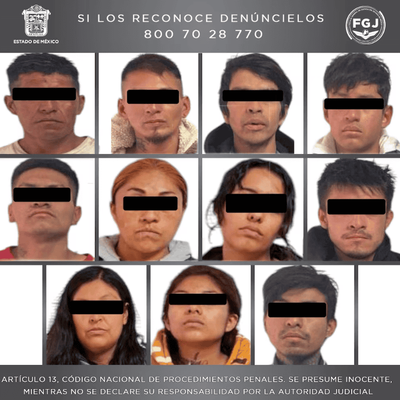 - Daniela "N" de 37 años de edad, Karen Jessica "N" de 29 años, Daniela "N" de 21 años de edad y Nancy Ofelia "N" de 20 años de edad, así como Ricardo "N" de 36 años, José "N" de 33 años, Cedrik de 24 años, José Yair "N", José Luis "N" de 43 años, José Alberto "N" de 20 años, Diego Manuel "N" de 20 años de edad y un menor de edad de 17 años fueron las personas capturadas.