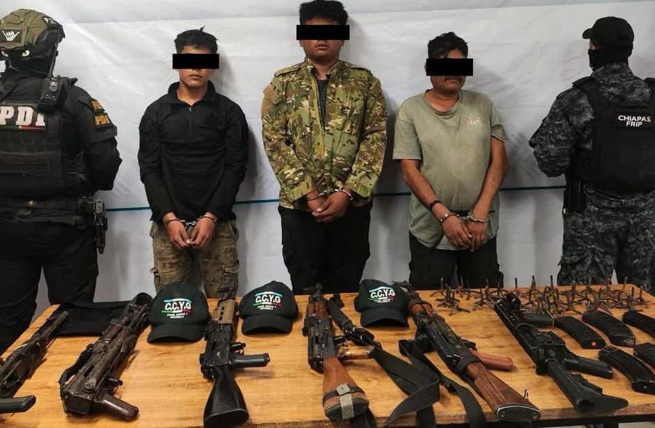 - Motivo por el que las autoridades fueron atacadas con armas de fuego, repeliendo la agresión y seria mediante un fuerte operativo de los guardianes del orden que metros más adelante lograran la detención de quienes responden a los nombres de José "N", Hedilberto "N" y Aldahir "N", al practicarles una inspección de rutina en su poder les fue asegurado, un arma larga calibre .223, cinco armas largas tipo AK 47; 40 poncha llantas y diversas vestimentas y gorras con la leyendas relacionadas al grupo criminal (C.C.y.G )(Cartel de Chiapas y Guatemala).