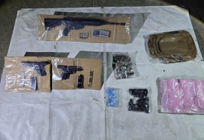 Durante la captura de estas personas les fueron aseguradas dos pistolas color negro, cartuchos útiles, un AR-15 con cargador y cartuchos útiles, una mochila tipo escolar con bolsitas transparentes con hierba seca -marihuana-, cocaína; bolsitas semitransparentes color negro con sustancia granulosa, con características similares a la piedra.