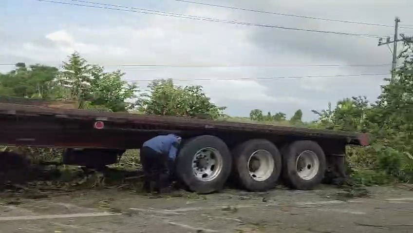 La mañana de ayer martes un caos vehicular en ambos sentidos de la carretera federal Villahermosa - Frontera, se registró la altura del kilómetro 32 en las inmediaciones de la curva en la ranchería El Espino derivado a un accidente de un tractocamión; que se encontraba fuera de la carpeta asfáltica.
