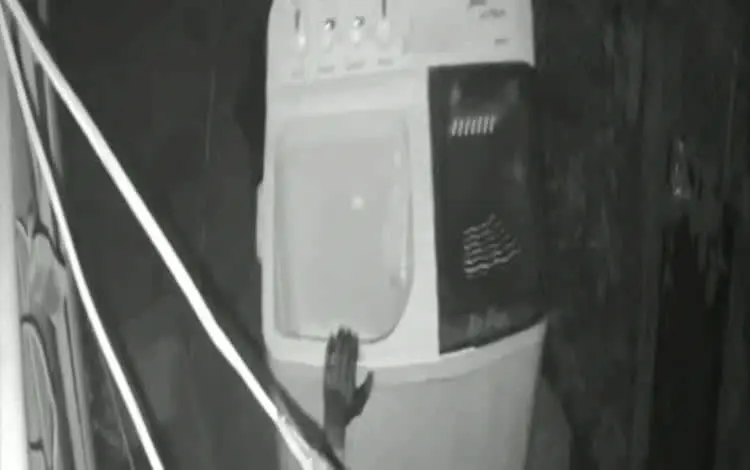 Su cómplice se quedó en la calle vigilando para que nadie sospechara, el ratero rápidamente se echó una lavadora al hombro, pero debido a que estaba grande y pesada no podía escalar la barda con ella y la dejó.