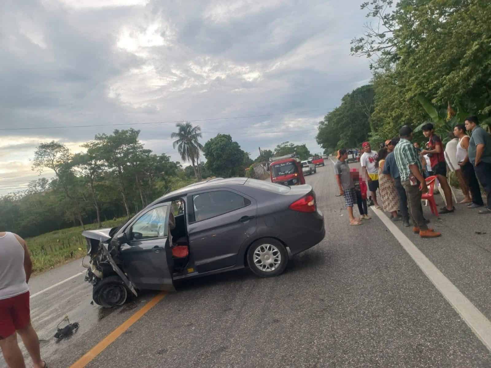 El choque de tres vehículos dejó múltiples daños materiales y tres personas lesionadas en la carretera federal Villahermosa - Escárcega, a la altura de la ranchería Pedro C. Colorado, segunda sección.