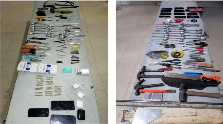 En varias celdas hallaron sustancias con características similares a la droga conocida como piedra, un PTR de aproximadamente 80 cm y 2 pulgadas de grosor, un bat de aluminio, un bat de madera y un cuchillo de sierra pequeño, martillos hechizos y dos módems de internet.