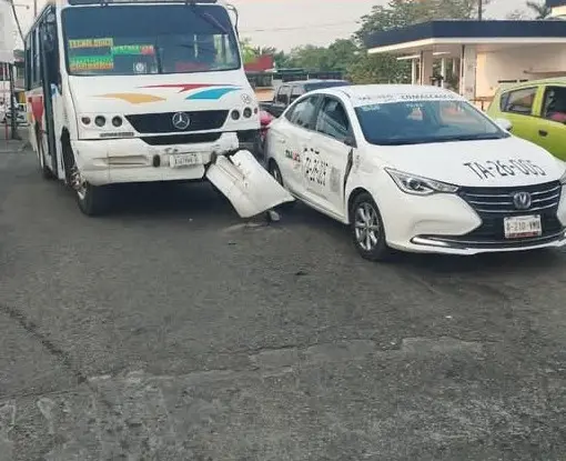 Un taxi fue impactado por un autobús frente a la terminal ADO en un choque por alcance que causó daños materiales importantes, aunque no hubo personas lesionadas.