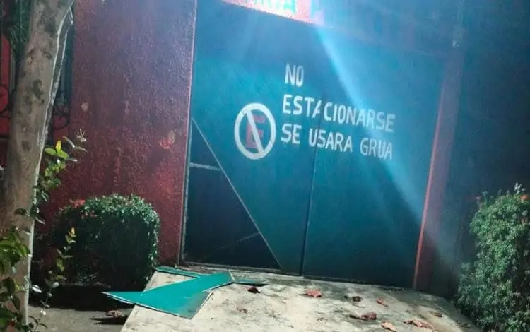 Según los primeros reportes, una camioneta propiedad de la empresa NADRO impactó el portón del inmueble, no sin antes reventar la cadena del área de estacionamiento, lo que provocó que las puertas quedaran abiertas.