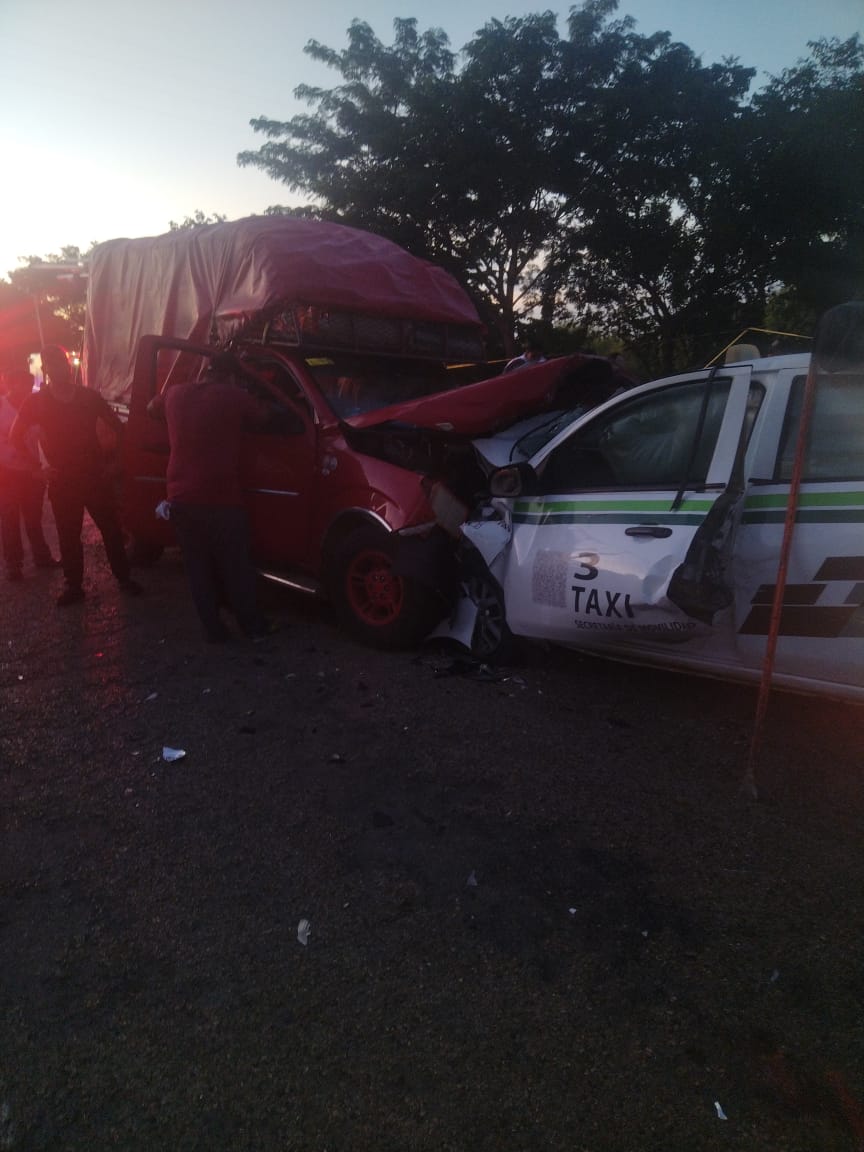 El taxi marcado con número 3, conducido por el chofer de nombre Arnaldo N, llevaba como pasajera a su esposa y se impactó de frente contra una camioneta que transportaba a trabajadores conocidos como "Los Palmeros".