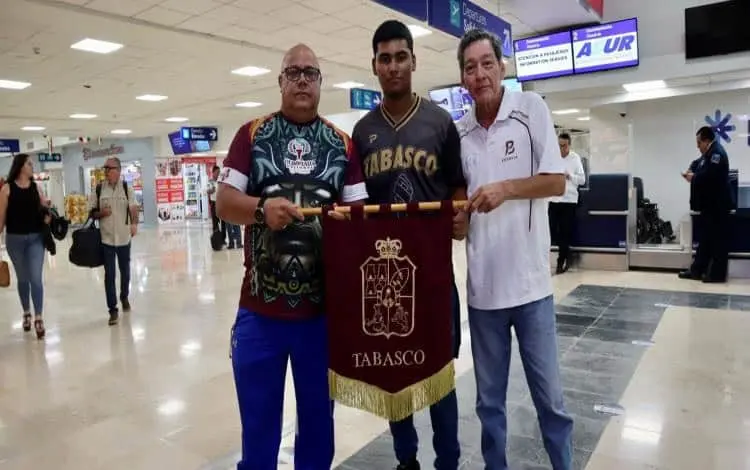 Dereck Izquierdo fue despedido por sus familiares en el aeropuerto de Villahermosa, donde también estuvo Hugo Casals, metodólogo del Instituto de la Juventud y el Deporte de Tabasco (INJUDET) y Jorge Peña, presidente de la Asociación de Beisbolistas de Tabasco.