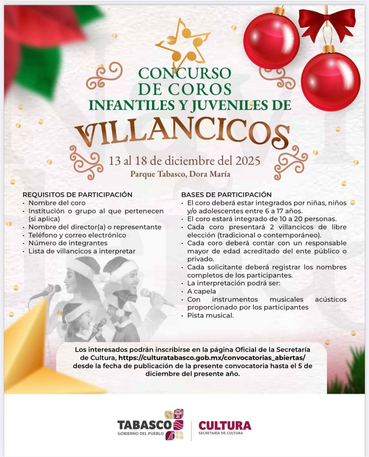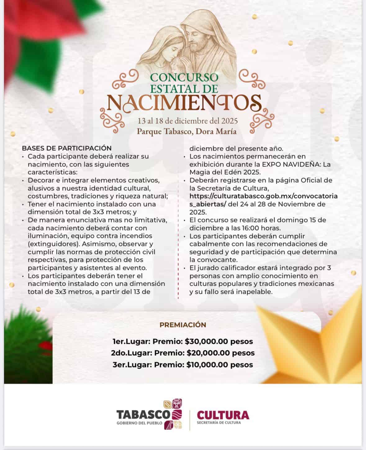 El Gobierno de Tabasco convoca a participar en los Concursos de Nacimientos Navideños, de Coros Infantiles y Juveniles, así como de Pastorelas que se llevarán a cabo en el marco de la Expo Navideña 2025 "La Magia del Edén".