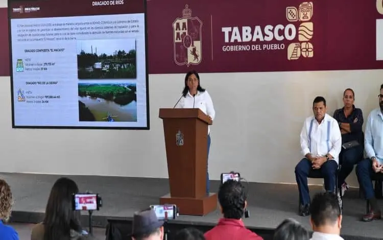 - Asimismo, informó que, como parte del programa de dragado de ríos en Tabasco, dado a conocer hace unos meses por la Presidenta Claudia Sheinbaum Pardo, el Gobierno de Territorio trabaja en coordinación con la Secretaría de Marina y la Conagua en el punto de la compuerta "El Macayo", con un volumen por dragar de 279 mil 733 metros cuadrados, sobre 37 kilómetros lineales.