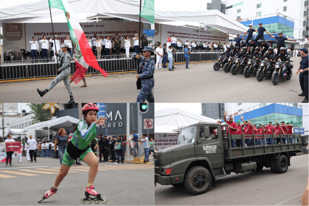 Marcharon escuelas, asociaciones deportivas, instituciones educativas y gubernamentales, así como Militares, Guardia Nacional y Seguridad Pública, quienes ofrecieron un homenaje a la Revolución Mexicana a través de representaciones históricas y demostraciones de disciplina.