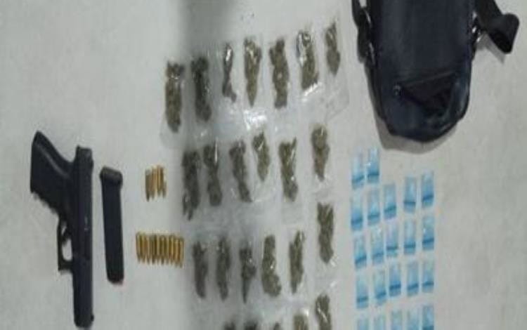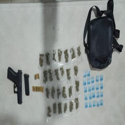 Al masculino se le aseguró un arma corta con cargador y 14 cartuchos útiles, bolsitas de plástico transparente que en su interior contiene hierba verde con características similares a la marihuana, bolsitas transparentes tipo Ziploc que en su interior contenían sustancia granulada con características similar al cristal.