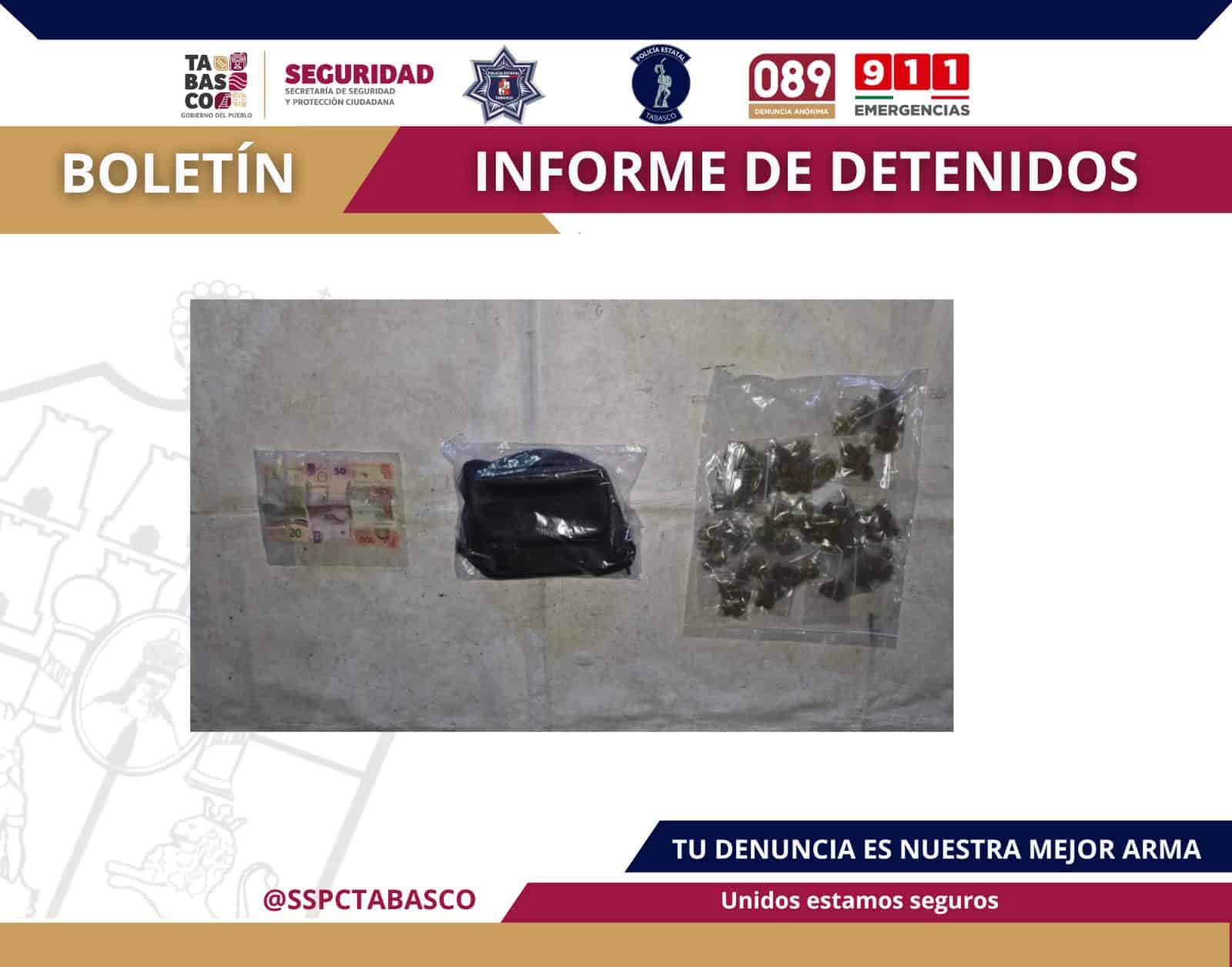 Durante el operativo se aseguraron bolsas que contenían hierba verde con características similares a la marihuana, así como una mariconera color negro y dinero en efectivo.